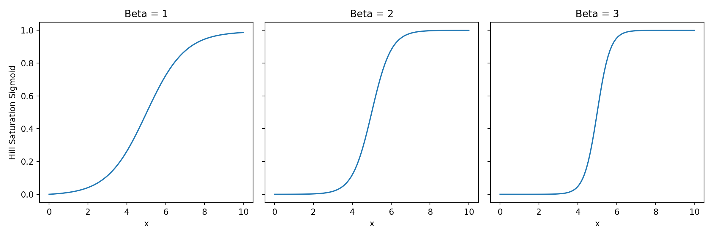 or array_likeThe value of the Hill saturation sigmoid function for each input value of x.