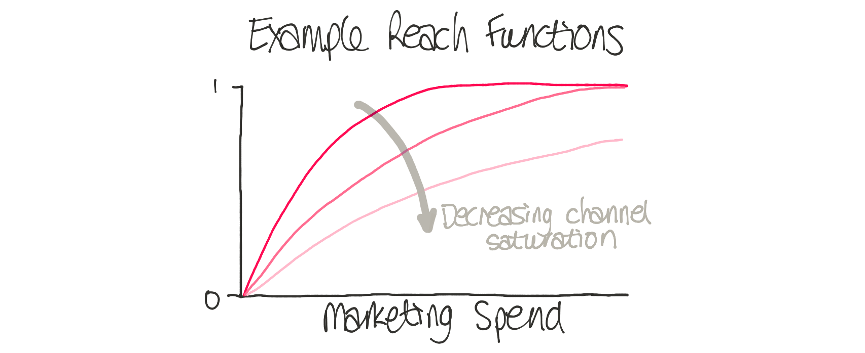 Rather than model our KPI as a linear function of marketing spend, the reach function models the potential saturation of different channels: While the initial money spent on an advertising channel might have a big impact on customer acquisition, further investment will often lead to diminishing returns as people get used to the message. When we think about optimization, modeling this effect is critical. Some channels may be nowhere close to being saturated and yield significant increases in customer acquisitions for spending for that channel. Knowing the saturation of each channel is vital in making future marketing spend decisions.
